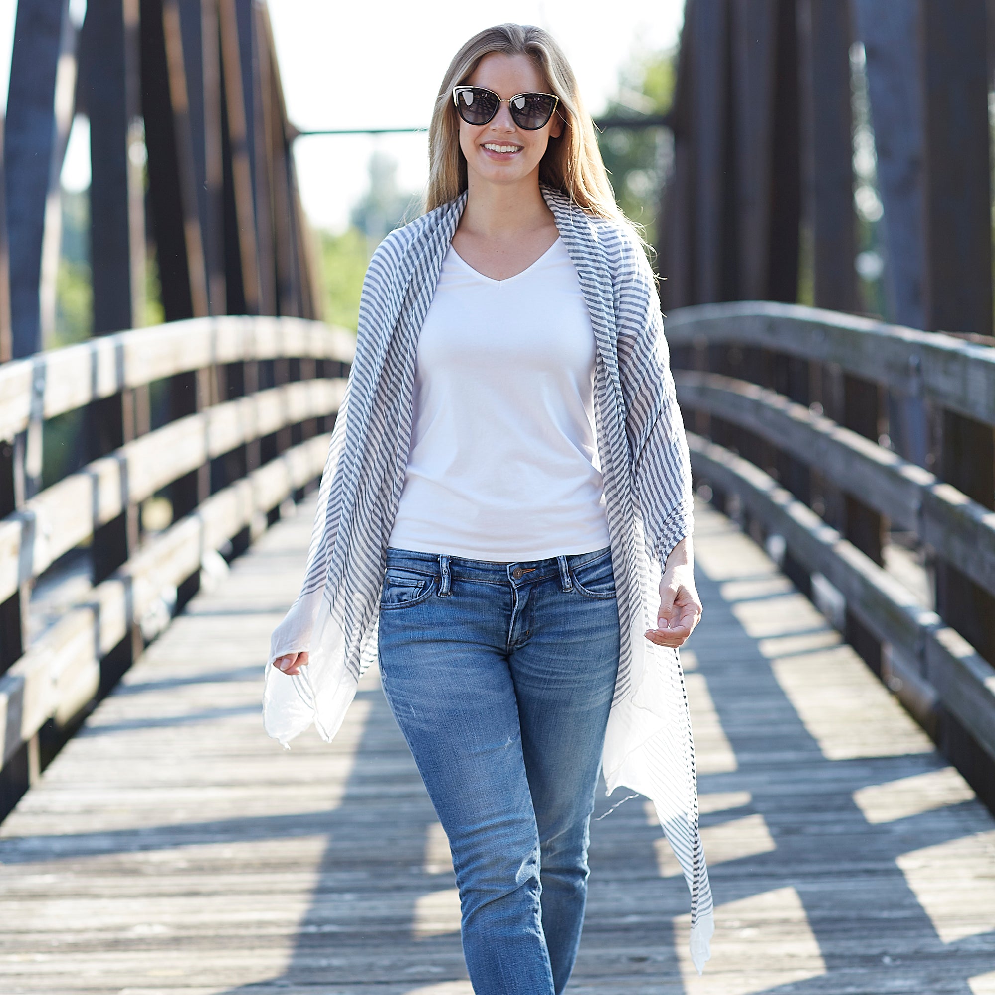 This soft, over-sized scarf will become your favorite take-along accessory. Ideal throughout hot-weather months thanks to its lightweight fabric, wear it as a shawl or wrap to cover your shoulders and torso; drape it over your legs at the dinner table, or simply wear it around your neck! However you wear it, you'll definitely want to keep this handy accessory in your purse wherever you go.
